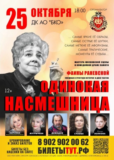 2518:00октябряДом Культуры АО "БКО"г. Боровичи1200 – 2900 рубОдинокая насмешницаНеповторимый, не придуманный авторами, а подлинный юмор Фаины Раневской, самые яркие ее образы, самые смешные ее анекдоты, самые меткие ее афоризмы, самые трагикомические моменты ее судьбы. Время действия — последний год жизни великой актрисы и человека.
