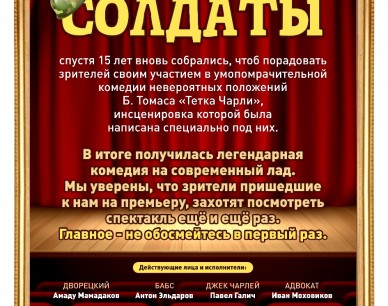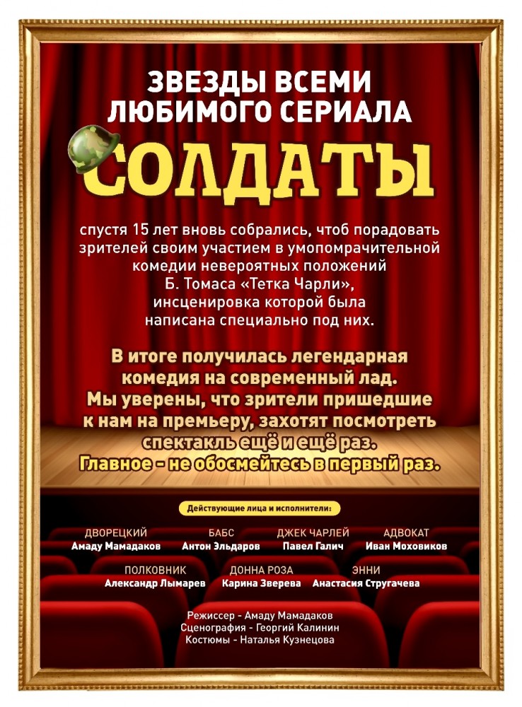 Звезды всеми любимого сериала «СОЛДАТЫ», спустя 15 лет вновь собрались, чтоб порадовать зрителей своим участием в умопомрачительной комедии невероятных положений БРЕНДОНА ТОМАСА «Тетка Чарли», инсценировка которой была написана специально под них. В итоге получилась легендарная комедия на современный лад.